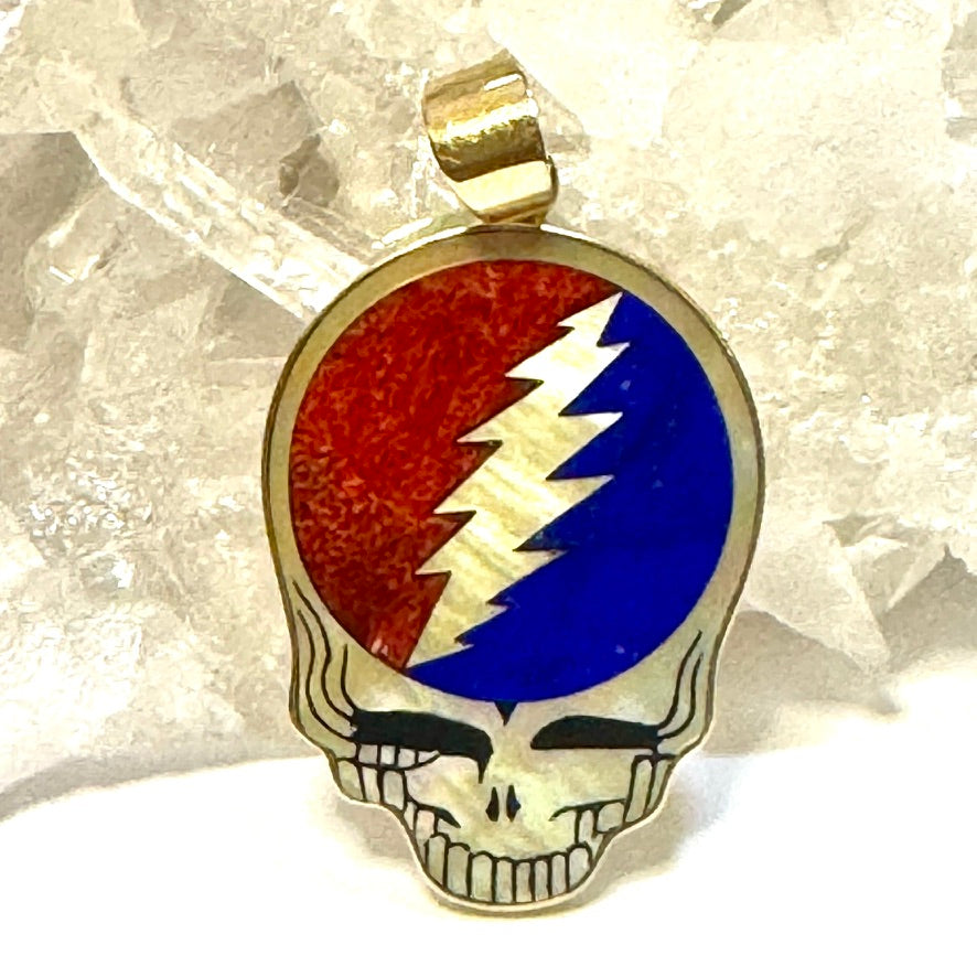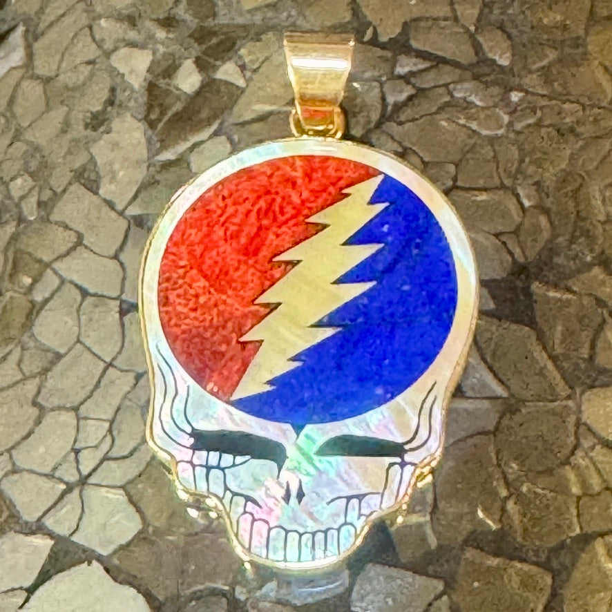 Intricate inlay work fills the Stealie with vibrant stones: deep blue lapis, radiant red apple coral, and luminous mother of pearl. The lightning bolt cuts boldly down the center, glowing with shimmering shell that captures light and color at every angle. The golden skull outline adds warmth and brilliance, making this piece a true collector’s treasure.