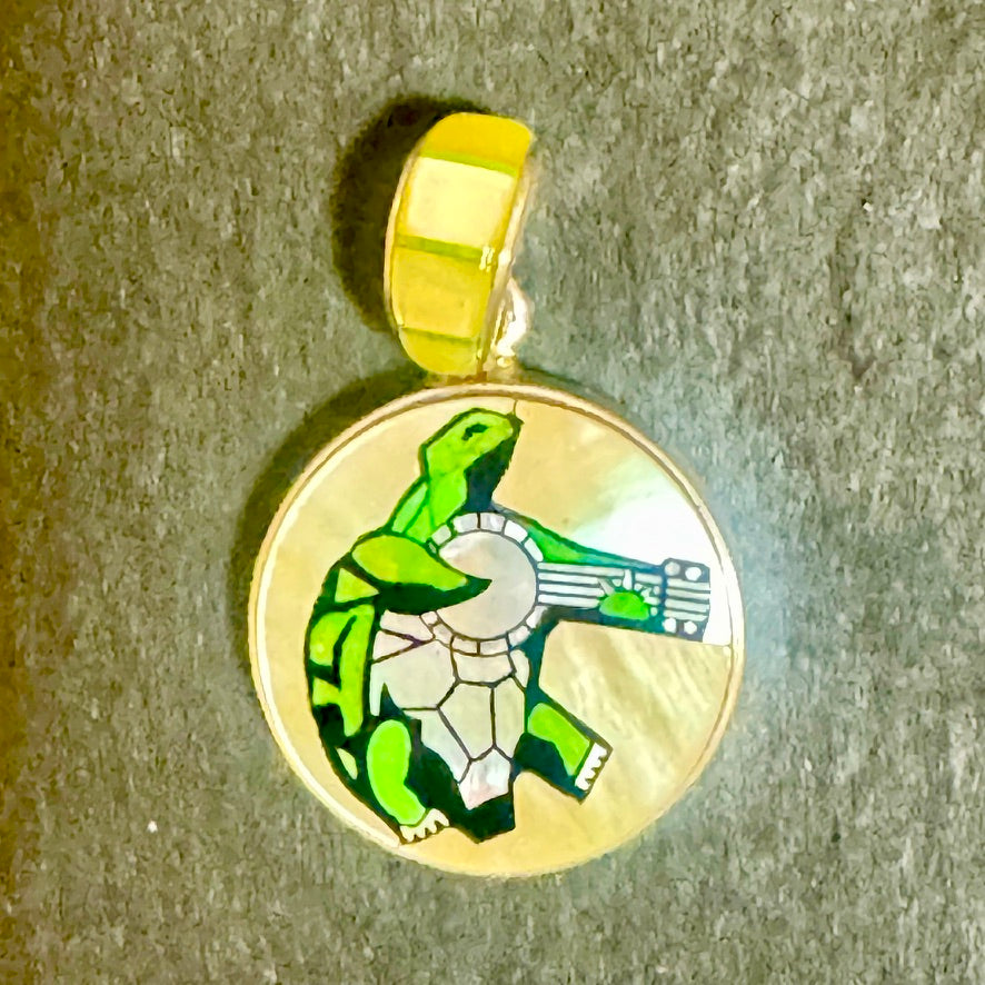 This pendant celebrates the timeless imagery of the Terrapin, one of the most beloved icons in the Grateful Dead universe. The round sterling silver frame holds a polished backdrop of luminous mother of pearl, creating a radiant stage for the inlay design. At its heart, a green terrapin stands upright, cradling a banjo in perfect harmony, a tribute to both the band’s music and the enduring spirit of Terrapin Station.