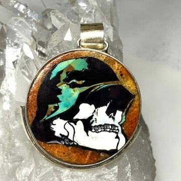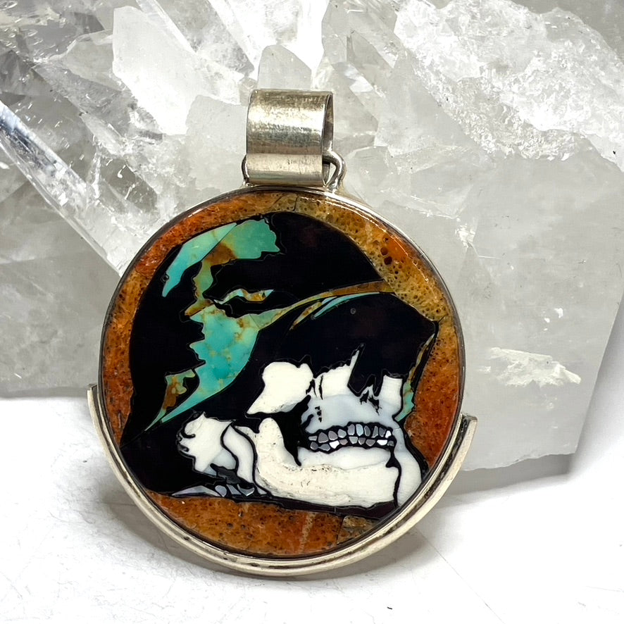 Dark, bold, and full of edge, this handcrafted pendant features a haunting skull figure cloaked in mystery. Set in sterling silver, the design is meticulously inlaid with rich apple coral, vibrant turquoise, deep jet, luminous mother of pearl, and crisp white shell, creating dramatic contrast and striking detail.