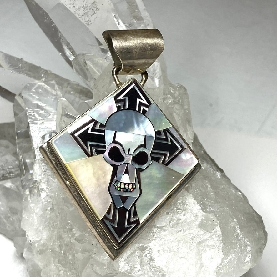 The pendant is inlaid with rich jet, shimmering mother of pearl, and flashes of iridescent lab-grown opal in the teeth, creating a dynamic contrast of dark and light. The layered patterns and bold symmetry give it a sense of movement and modern edge.