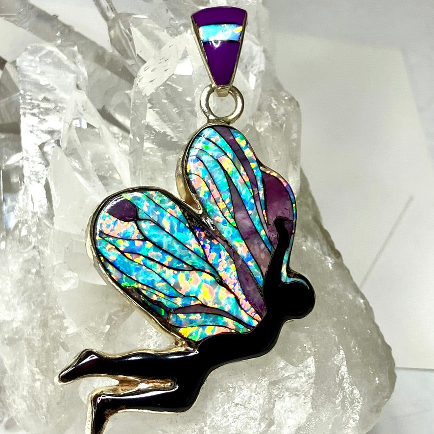 The wings dazzle with a mosaic of vibrant lab-grown opal and deep purple turquoise, catching the light in brilliant flashes of blues, pinks, and golds. A matching inlaid bail with layered opal and violet accents completes the design, enhancing its magical, otherworldly charm.