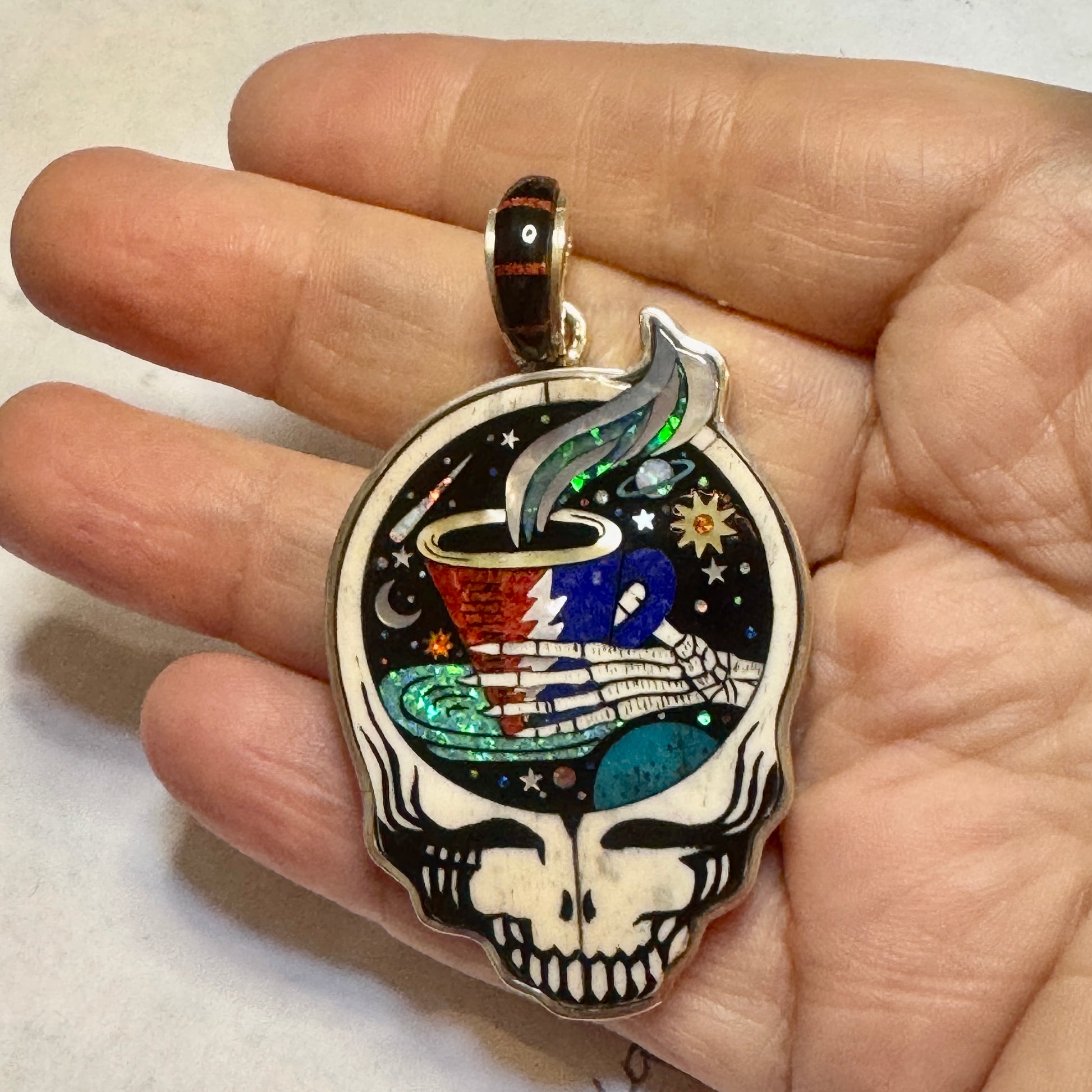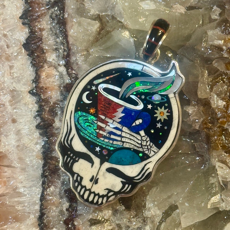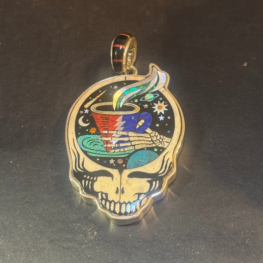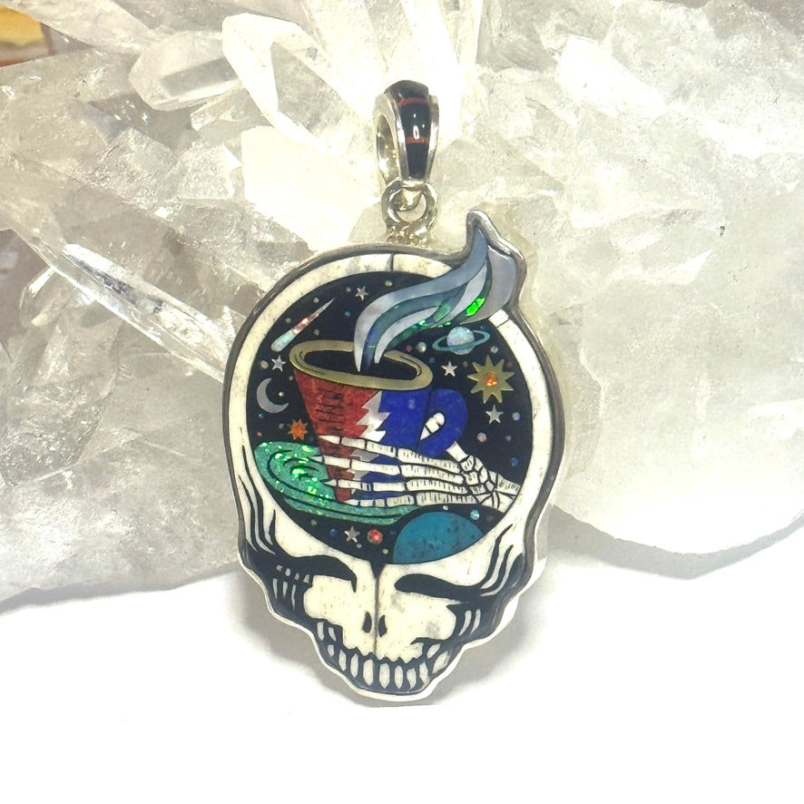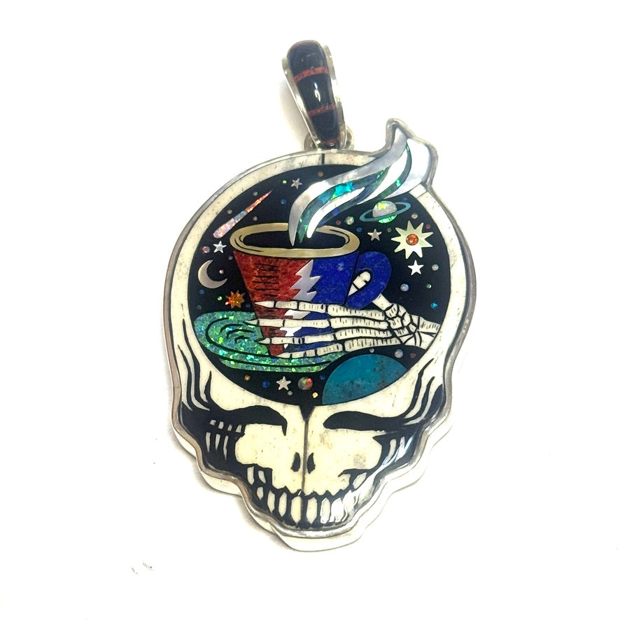 Blast off into a cosmic caffeine journey with the Galaxy Coffee Cup Stealie pendant. This officially licensed Grateful Dead piece features a skeletal hand offering up a cup of celestial brew, framed inside the iconic Steal Your Face silhouette. A night sky bursts with stars, moons, and orbiting planets behind the cup, all brought to life in brilliant inlay work.