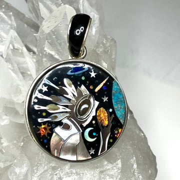 Inspired by the visionary artwork of John Roberts, this sterling silver pendant captures the spirit of celestial reverence and cosmic connection. The central figure, reminiscent of Roberts’ signature otherworldly beings, gazes skyward in awe. It is inlaid with mother of pearl, jet, turquoise, and luminous lab-grown opal, evoking a divine communion between earth and stars.