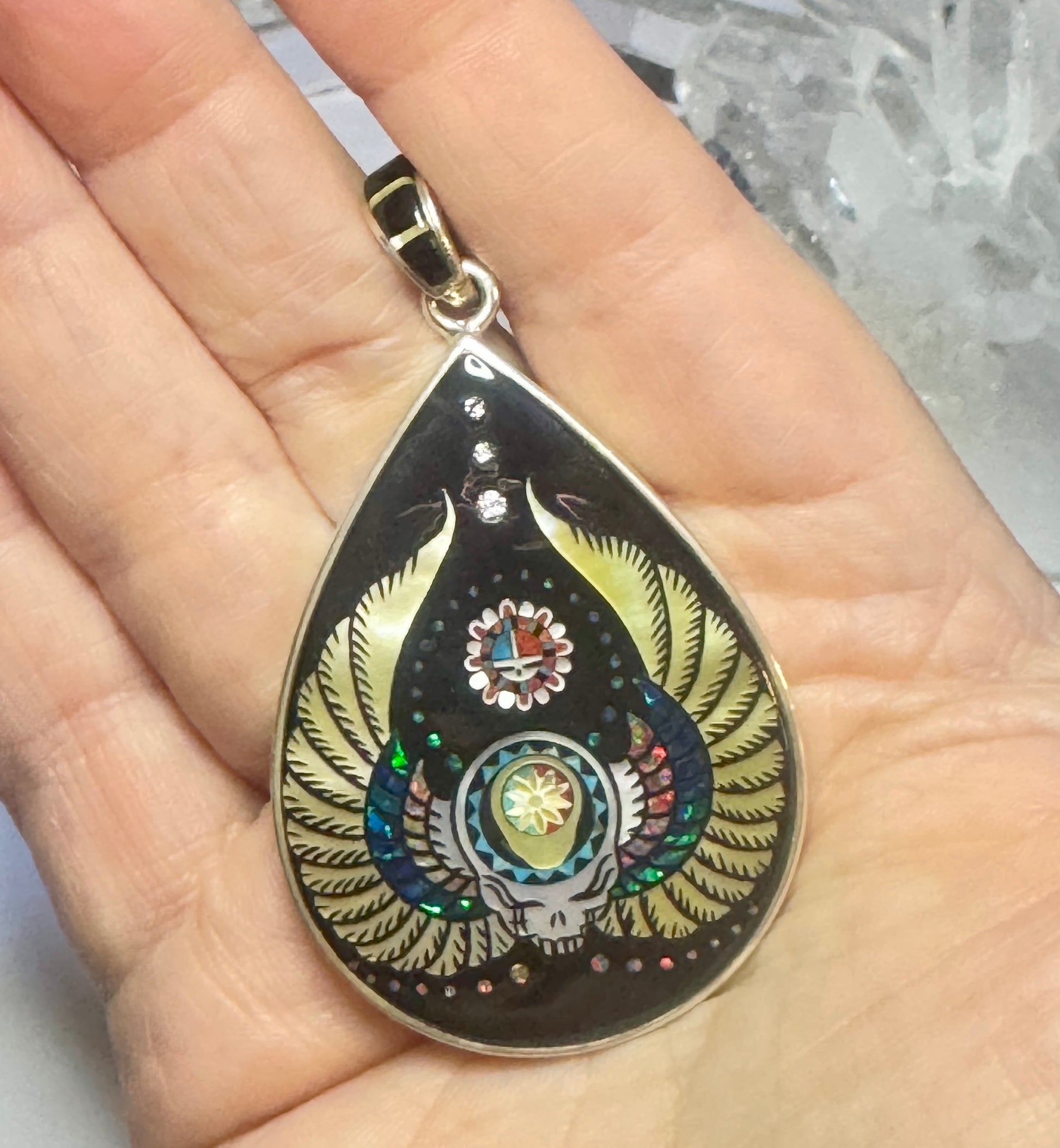 An elevated tribute to classic Grateful Dead iconography, this teardrop-shaped pendant features the Winged Steal Your Face emblem in a bold, radiant composition. The intricate inlay work brings out every detail in stunning contrast—gleaming wings, celestial geometry, and luminous color all centered around a powerful SYF skull.